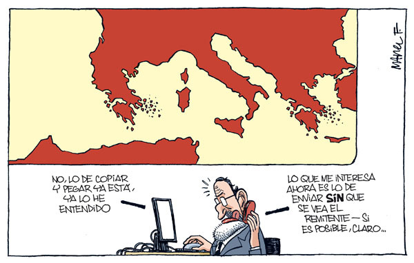 “’No, I already understand how to copy and paste,’ says the bearded man on his mobile to some kind of computer helpline. ’What I want to do now is to send without revealing the sender, if it’s possible, of course.’” A cartoon by Manel Fontdevila, wonderfully commenting on the possibly impending financial doom in the EU. I found it at Strange Maps.