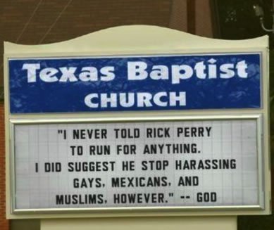 (image description: Church sign that reads “I never told Rick Perry to run for anything. I did suggest he stop harassing gays, Mexicans, and Muslims, however.” — God)