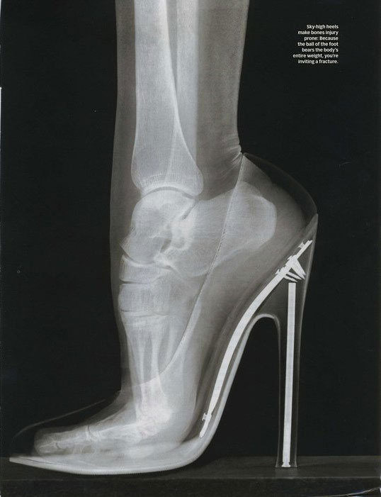 [Image: An x-ray of a photo in a very high heeled shoe. Very small caption on the picture reads: “Sky high heels make bones injury prone: Because the ball of the foot bears the body’s entire weight, you’re inviting a fracture.”]