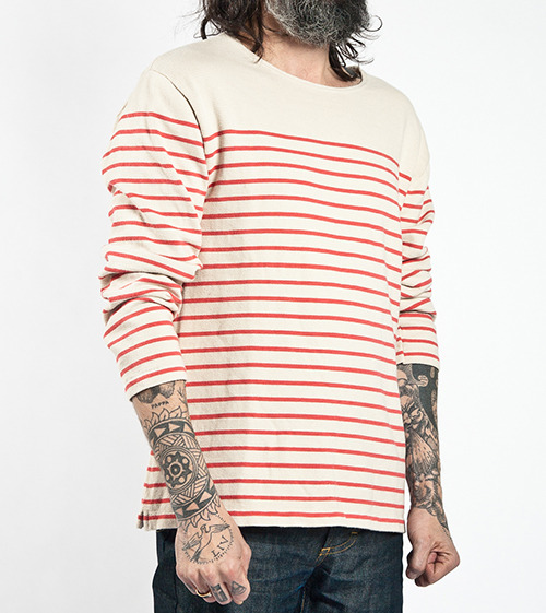 I like how the tattoos, the thin body and arms and the clothers look and feel young, but the gray beard hints at the actual age of the model. The look is relaxed but the clenched fists bring in a certain tension.