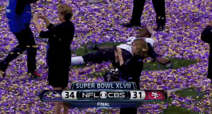 Baltimore Raven making a confetti angel after winning Super Bowl
