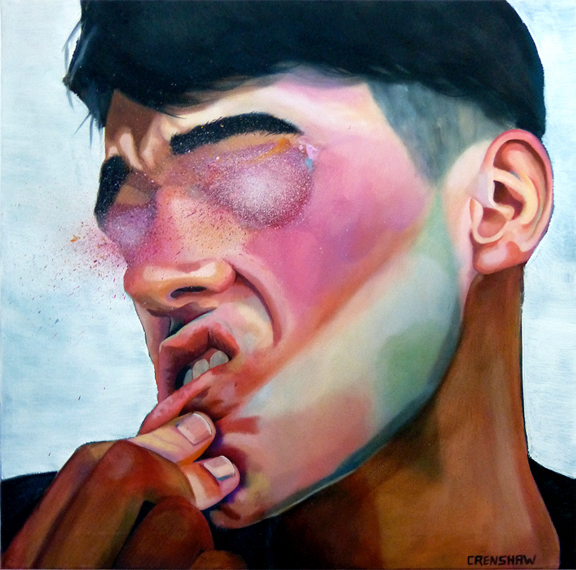 Based in Hamburg, Germany, Carina Crenshaw creates delicate paintings that experiment with color to convey different lighting conditions and moods. Crenshaw’s brushstrokes reminiscent are at times reminiscent of 20th-century abstract painting: blocks of color are built up next to one another to create works that appear flat despite their luminous effect. Crenshaw’s works zero in on subjects’ faces; they don powerful expressions that seem to place them in rich narrative contexts that the viewer must piece together based on the limited information.