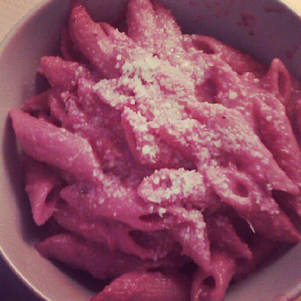 Tried something different for lunch: Penne with a roasted beet sauce. Delicious.