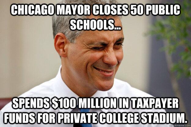 Mayor Rahm Emanuel and the City of Chicago recently announced that 50 schools will ‘have to’ be closed – and that they’ve commited to spend $100 mil for DePaul’s basketball arena.