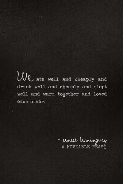 Image [white typewriter font on black] is a Ernest Hemingway quote from A Moveable Feast: