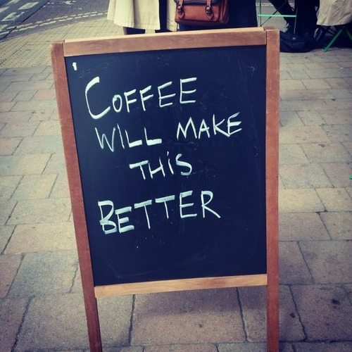 [Image is a sign outside a café that reads: coffee will make this better.]