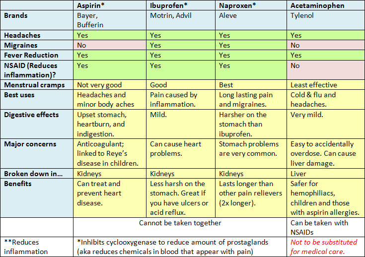 I keep forgetting what the differences are in the over the counter pain relievers, so I made a handy chart.