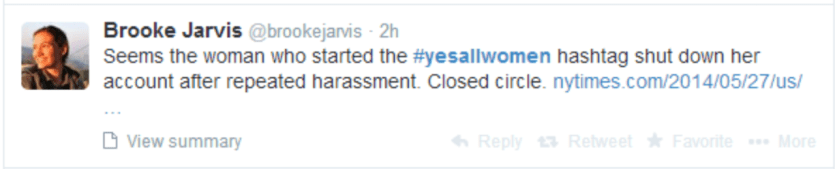 just to be clear – a woman who created a hashtag meant to convey the message “no, not all may be sexual aggressors but yes, all women have experienced sexism to some degree” shut down her account after repeated harassment. she wasn’t generalizing men. she wasn’t making broad, sweeping statements that people claim are the problem with women’s movements. she was only opening a conversation centered around personal stories. what is anyone supposed to take from this except that many people are simply not interested in hearing these stories at all, as sugarcoated as they may be, as tactfully they may be put? not without redirecting the conversation to focus away from women, at any rate.