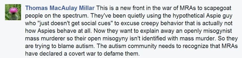 “This is a new front in the war of MRAs to scapegoat people on the spectrum. They’ve been quietly using the hypothetical Aspie guy who "just doesn’t get social cues” to excuse creepy behavior that is actually not how Aspies behave at all. Now they want to explain away an openly misogynist mass murderer so their open misogyny isn’t identified with mass murder. So they are trying to blame autism. The autism community needs to recognize that MRAs have declared a covert war to defame them.“ – Thomas MacAulay Millar
