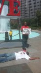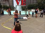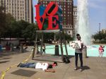 A silent protest in Love Park, downtown Philadelphia orchestrated by performance artists protesting the murder of Michael Brown in Ferguson. The onslaught of passerby’s wanting to take photos with the statue exemplifies the disconnect in American society. Simply frame out the dead body, and it doesn’t exist.
