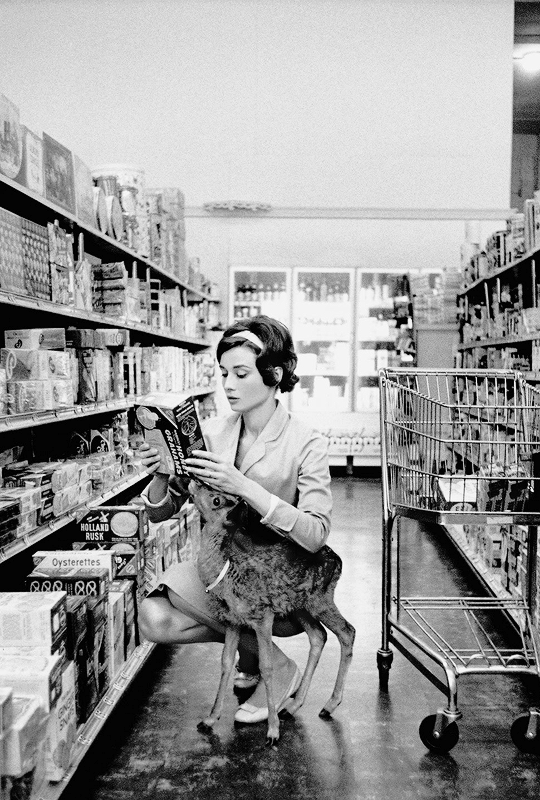 Audrey Hepburn photographed by Bob Willoughby shopping in Beverly Hills with her pet fawn Ip, 1958